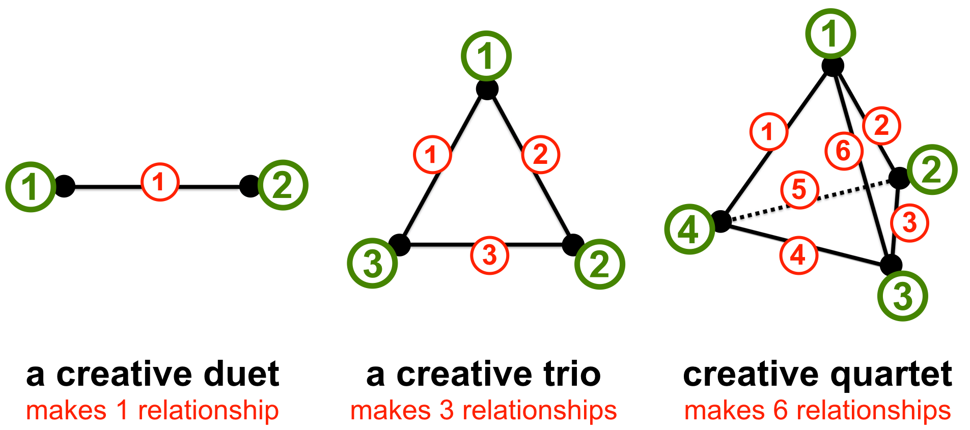 Provided communities are able to cultivate a diversities-of-diversities at the local level, this would enable them to harvest an ultimate 'synergies-of-synergies' (c.f. Fuller, 1975). From our experience of running 'creative quartet' workshops we found that a sympathetic understanding of team synergies is the key to noticing, and cultivating, other synergies. However, because synergies are 'emergent' entities, their mathematical properties are not summative. For example, in a team of 2 each member is (co-)responsible for 100% of all of the relations (i.e. 1), because either party has the power to veto the relationship that may be vital to success. (see fig. 1 below).