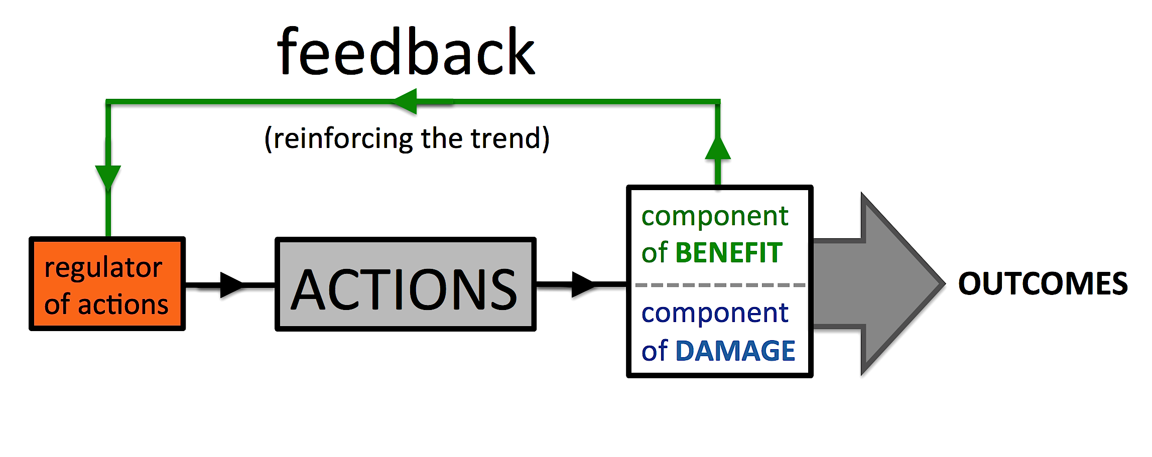 Figure 2 depicts a system in which the feedback loop was designed to regulate only the unwanted processes from a given situation. This could be a sketch of a hospital's progress in which feedback ignores the successes and reflects the number of patient fatalities. While the diagram suggests that this number would be reduced, it may also remind us that choosing appropriate 'performance indicators' is vital for successful outcomes. For example, instead of choosing wellbeing, or happiness as an economy's performance indicator, most governments have use GDP. This encourages overconsumption which causes costly health problems such as obesity, diabetes, etc.. Ultimately, it will be counterproductive, because all economic endeavour depends upon (and is intended to provide) a certain level of public wellbeing.