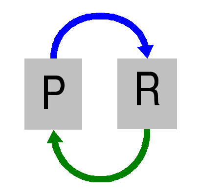 FEEDBACK TAKES TIME: It is important to remember that feedback takes time to take effect. In the feedback diagram (above right), for example, P sends information to R, which then replies with new information. This means that the state of P will alter, after it has sent its information. But not all feedback has the same effect - while some works to affirm the information sent out (i.e. called POSITIVE FEEDBACK), other feedback has the opposite effect (i.e. NEGATIVE FEEDBACK). N.B. Positive just means REINFORCING: There are no value judgements implied by the adjectives 'positive' or 'negative' when used with the word . They merely specify whether the feedback reinforces (i.e. in positive feedback) or moderates the original process (as in negative feedback).