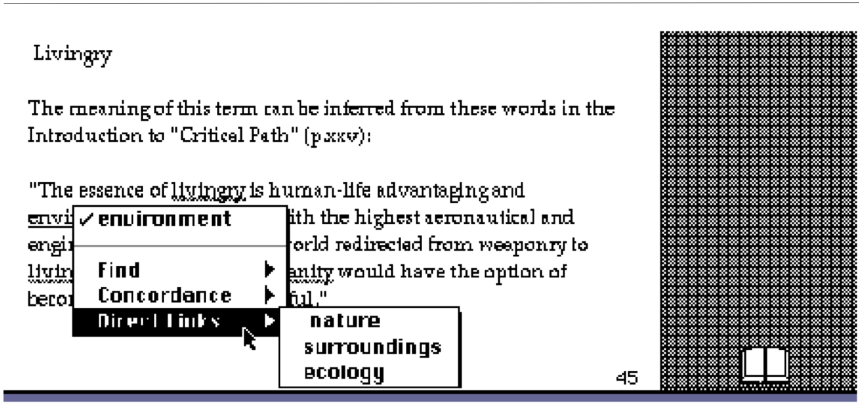 In 1945, Vanevar Bush called for the development of a new type of "mechanised private file and library". He envisaged a mechanical device with which users could make their own associative leaps; creating mnemonic codes and 'connecting' data items together into information 'trails'. This led to the arrival of 'hypertext'. Now well established as a set of software tools for text handling and reader-guidance, hypertext is known for its 'non-linearity'. This chiefly derives from the fact that the user is encouraged to discover individual 'reader pathways', and is therefore likely to experience a more chaotic sequence of ideas than those organised in conventional linear text.