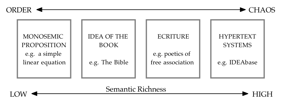 The tendency for linear text to precipitate divergent properties is not new. It has been argued (Knoespel, 1991) that even the most monosemic, stable arguments in mediaeval biblical texts were challenged by familiar (but abductive) examples offered as explanatory metaphors. This points to the presence of chaos near to the centre of the most linear propositions. Knoespel suggests that the 'exemplum' provided the Middle Ages with the means to examine daily life and therefore can be seen as a counter force to the bible. "The 'example' is an advantageous figure with which to consider reading because it not only disrupts our viewpoint by making us refigure the fable but also offers a potential frame for ordering our re-assimilation of the story."