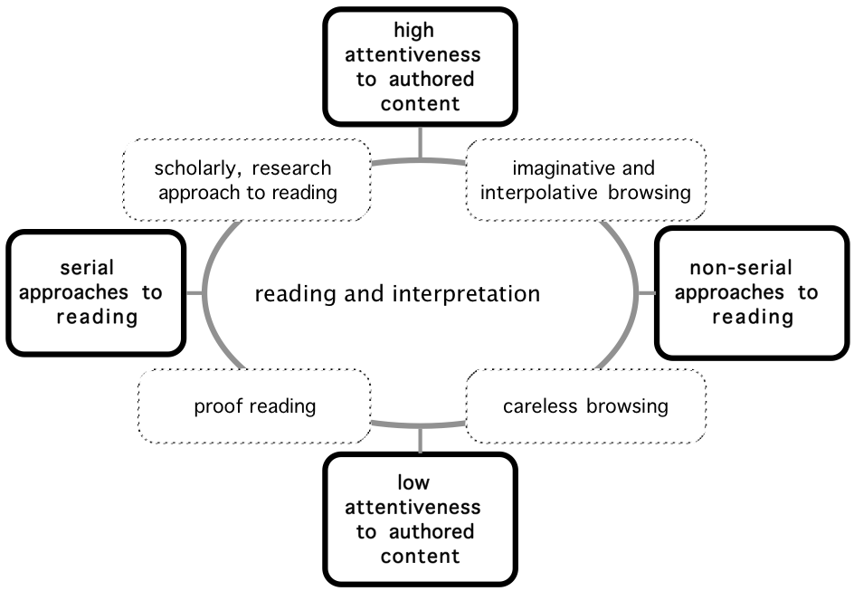 This new paradigm of physics may serve as a useful metaphor for the curriculum in the age of chaos. A proof-reader (see figure 3) is trained to follow a strict linear path through the text, attracted only by deviant spellings and typographic details. Where linear text mode provides explicit hierarchies of (author-led) meaning (e.g. main title, heading, followed by sub-heading, etc.) we might regard the main title as a 'fixed point' attractor with a reasonably linear correspondence to the frequency with which the proof reader notices it. By contrast, a casual reader who is browsing may well follow a far less predictable text path. Ruelle has remarked that 'strange attractors' are psychoanalytically "suggestive", and we may assume that practically any textual unit or attribute can become an attractor if it is currently provocative to the reader's unconscious search agenda.