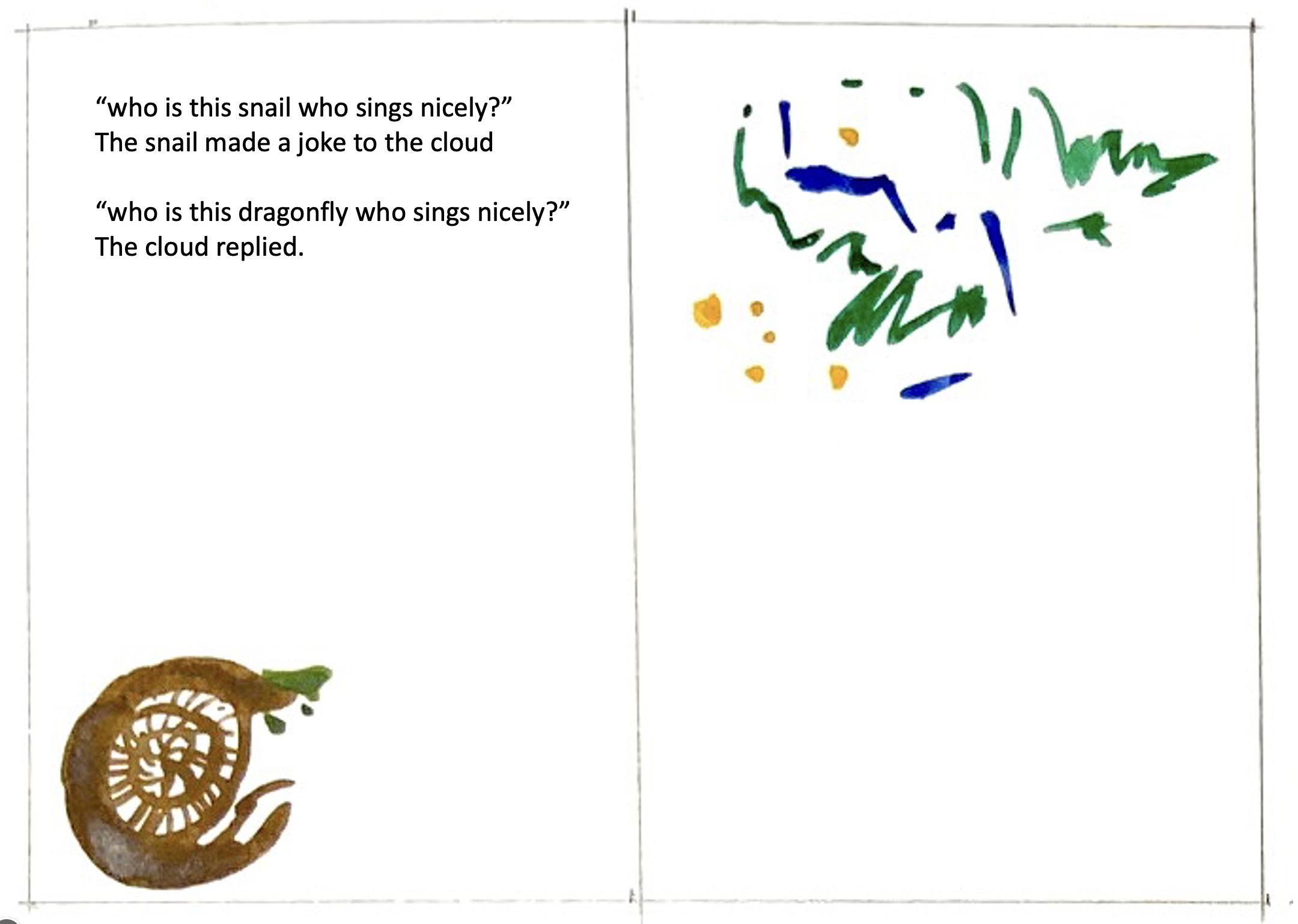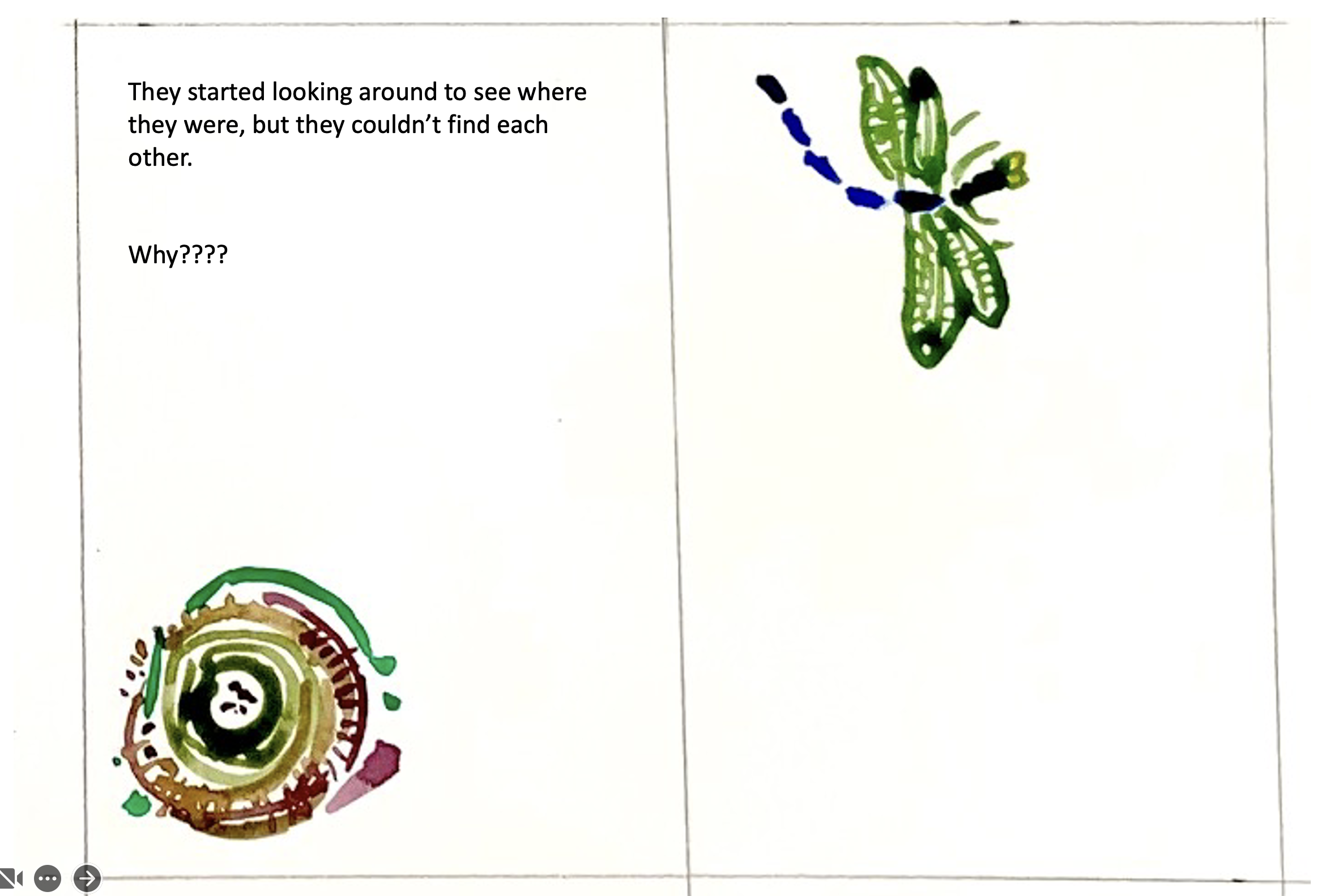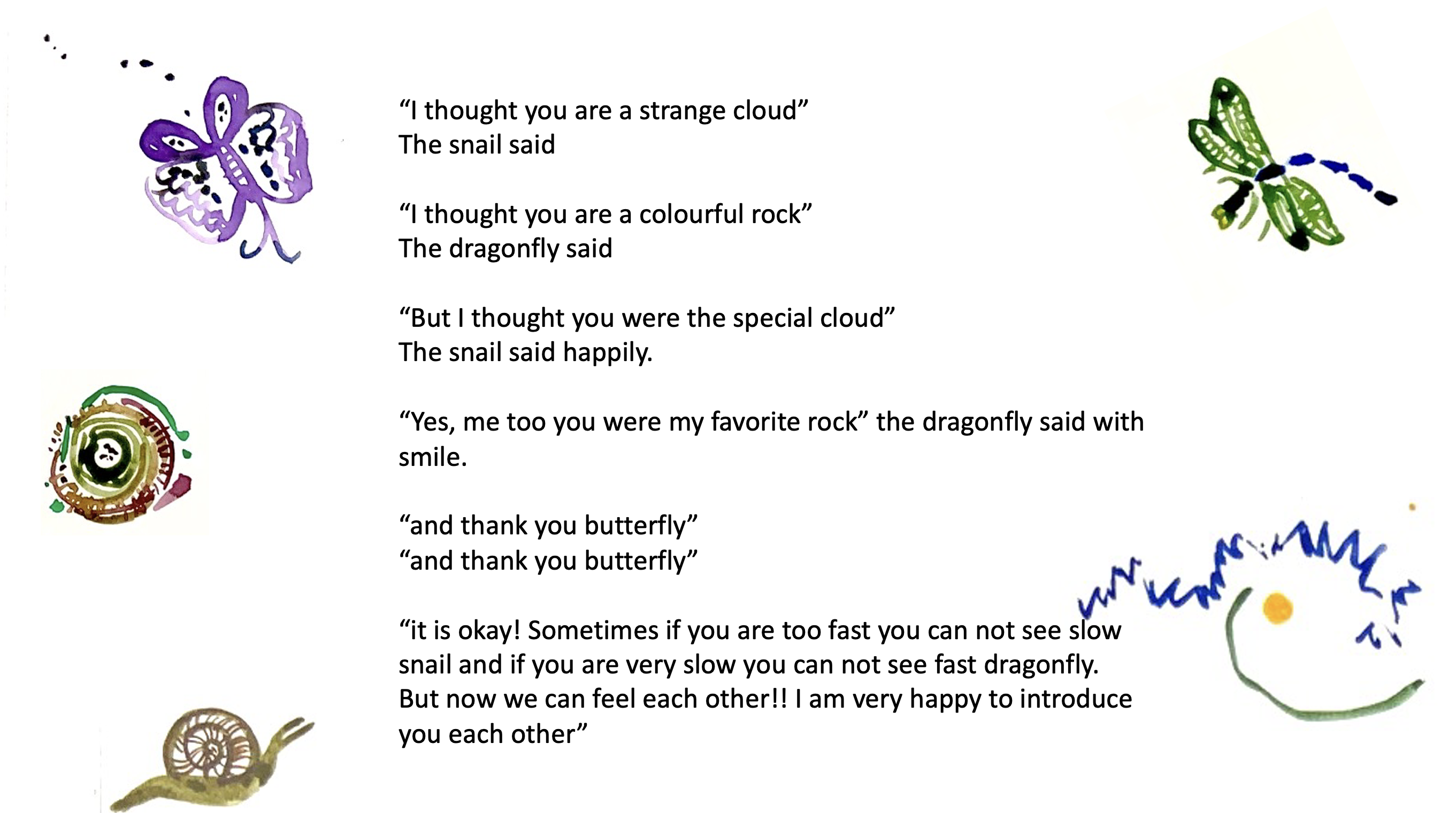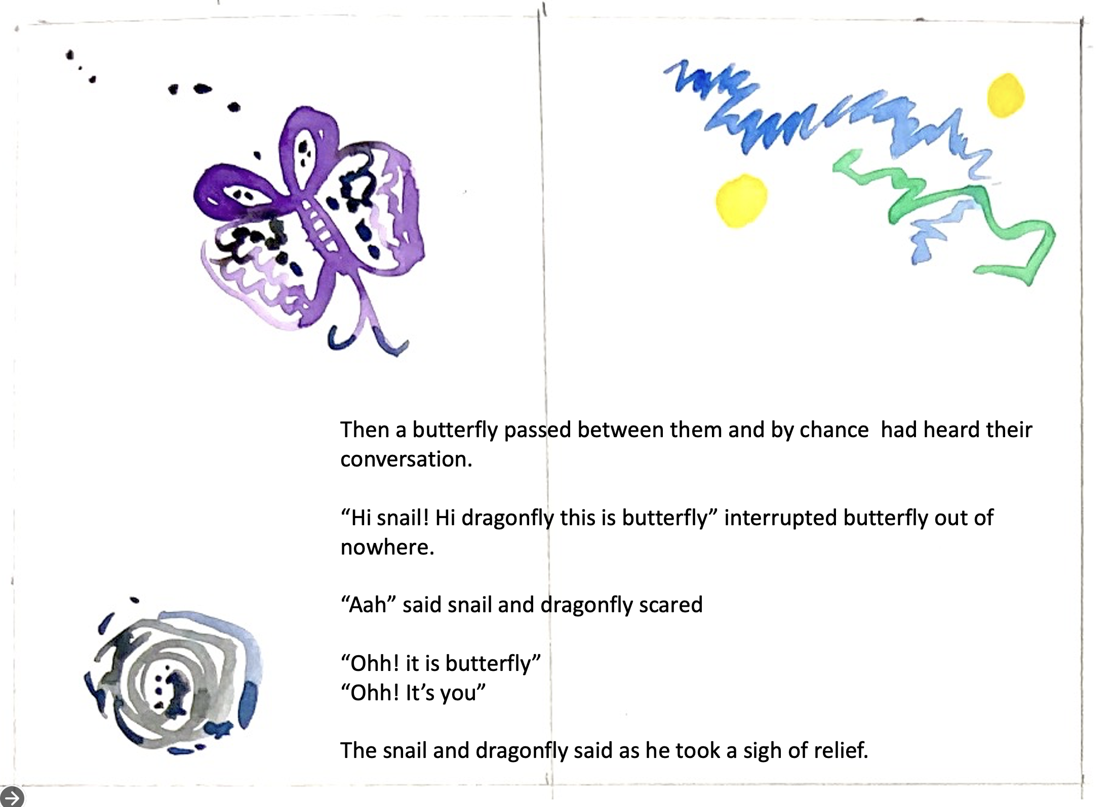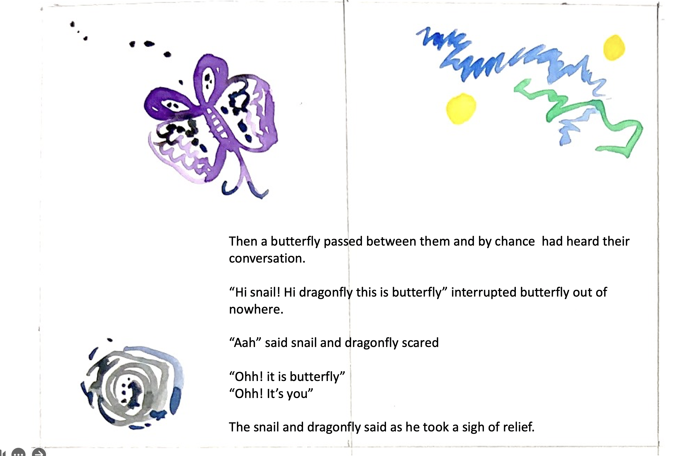 “Hi snail! Hi dragonfly this is butterfly” interrupted butterfly out of nowhere.