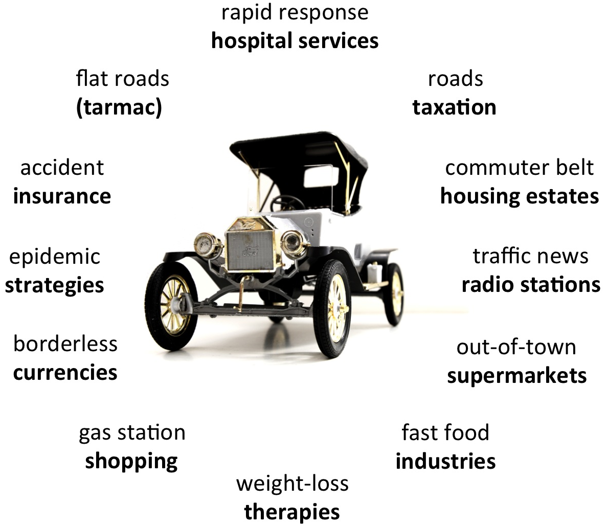 How might we go about eradicating cars from cities? This may entail understanding the Fordist paradigm as part of a larger, Taylorist paradigm (c.f. Fleischman, 2000 pp.597-624). One way to map this is to describe the success of the automobile in eco-mimetic terms (Kauffman, 1995, p.240). Whether the vehicle at the centre of figure 1 (at start of article) is a ‘sustainable’ electric car or a gas guzzling petrol engine is relatively unimportant. Each is merely a different version of the same paradigm, which requires the same infrastructure to co-sustain the way we shop, go to work, meet friends, or visit other places. This picture shows eleven, and these could be seen as paradigms in their own right. In addition to their co-sustainment with the automobile, each paradigm also has a relationship with each other. But it is not a weak, abstract relationship. It is an acquired, co-dependent affinity that has led to habits of exchange. Maturana and Varela refer to this as ‘structural coupling’ (1980, p.xxi), where the conduct of a given player is also a function of the conduct of the others in the system. If this were not complex enough, figure 2 (below) offers a bigger snapshot of the whole paradigm. ^