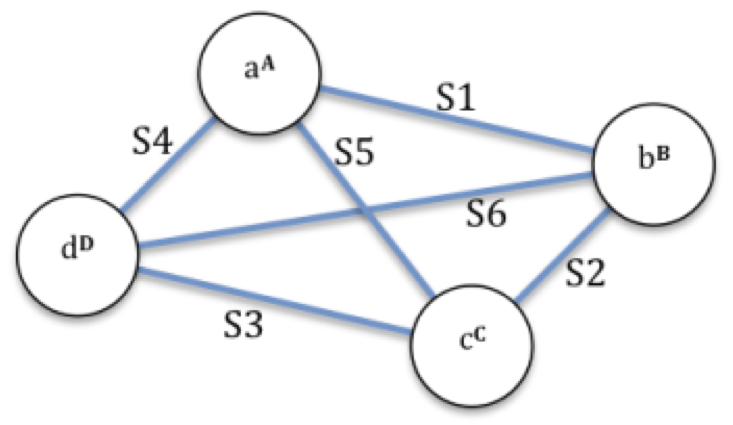 Figure 3 (below) represents a group of 4 agents (a,b,c,d) acting as ‘carriers’ of four assets (A,B,C,D) e.g. ideas/principles/knowledge sets/skills, where each paired asset has the potential of generating a synergetic outcome (S1 to S6).