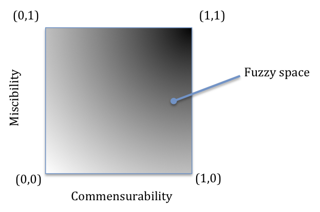 This provides for an interesting set of possibilities, but before scrutinising the possible relationships more closely it is useful to examine the measures associated with the above factors. All declare a benchmark for either the absence or complete fulfillment of the attribute concerned. This is because the extremes of range are more readily determined and are opposites of each other as would be expected. However, the qualities suggest there would be intervening gradations though these would be hard pushed to align to an agreed scale. This might be viewed then as a ‘fuzzy’ value set (Zadeh, L., 1974) whereby the range exists but defies certainty of measure. This is complex and can be simplified (defuzzified in Zadeh terms) by pivoting values about the mid-point and suggest a tendency toward an end value qualified by a loose probability or perceptive term (e.g. slightly 1, near zero etc). The mid-point itself is a paradox as in fuzzy terms it tends to neither and both (Kosko, B., 1994).