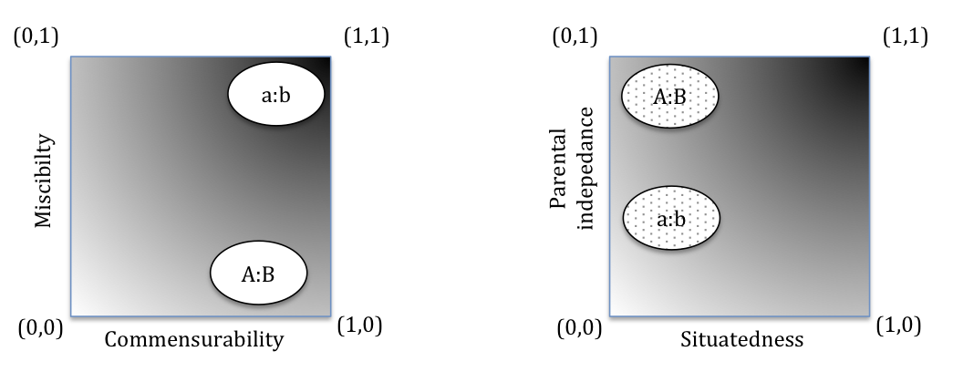 This analysis can easily be extended to produce profiles of the paired working relationships that build as a visual. Consider the attributes of commensurability and miscibility for a pair of agents (a:b) in this process. Together this will provide an indicator of how well are they matched and their ability to collaborate effectively.