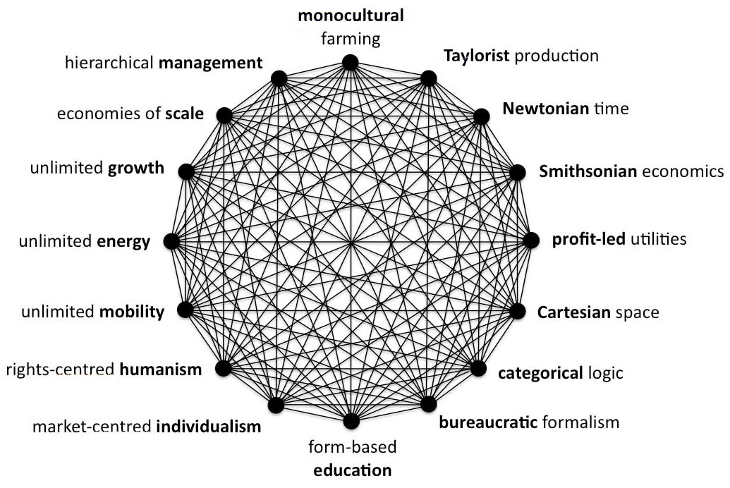 For example, many architects are trained to invent numerous iterations to high-rise offices. However, radically re-thinking the underlying (high-carbon) paradigm of concrete, steel and glass is much more difficult. Like all paradigms, this system of building seems 'normal' to us. It is ubiquitous to virtually all cities in the world, whether in London, New York or Beijing. Here, it may be helpful to consider all complex systems as 'paradigms' as a way to reflect upon ecosystems in a way that relates to the systems that are familiar to designers. Both contain animate, and inanimate, agencies and sustain themselves by attracting new elements that serve to support them (Kuhn, 1962; Maturana & Varela, 1980; Lovelock, 1979). Hypothetically speaking, redefining the agreed purpose of a paradigm should make it easy to change (c.f. Meadows, 1999, p. 18).