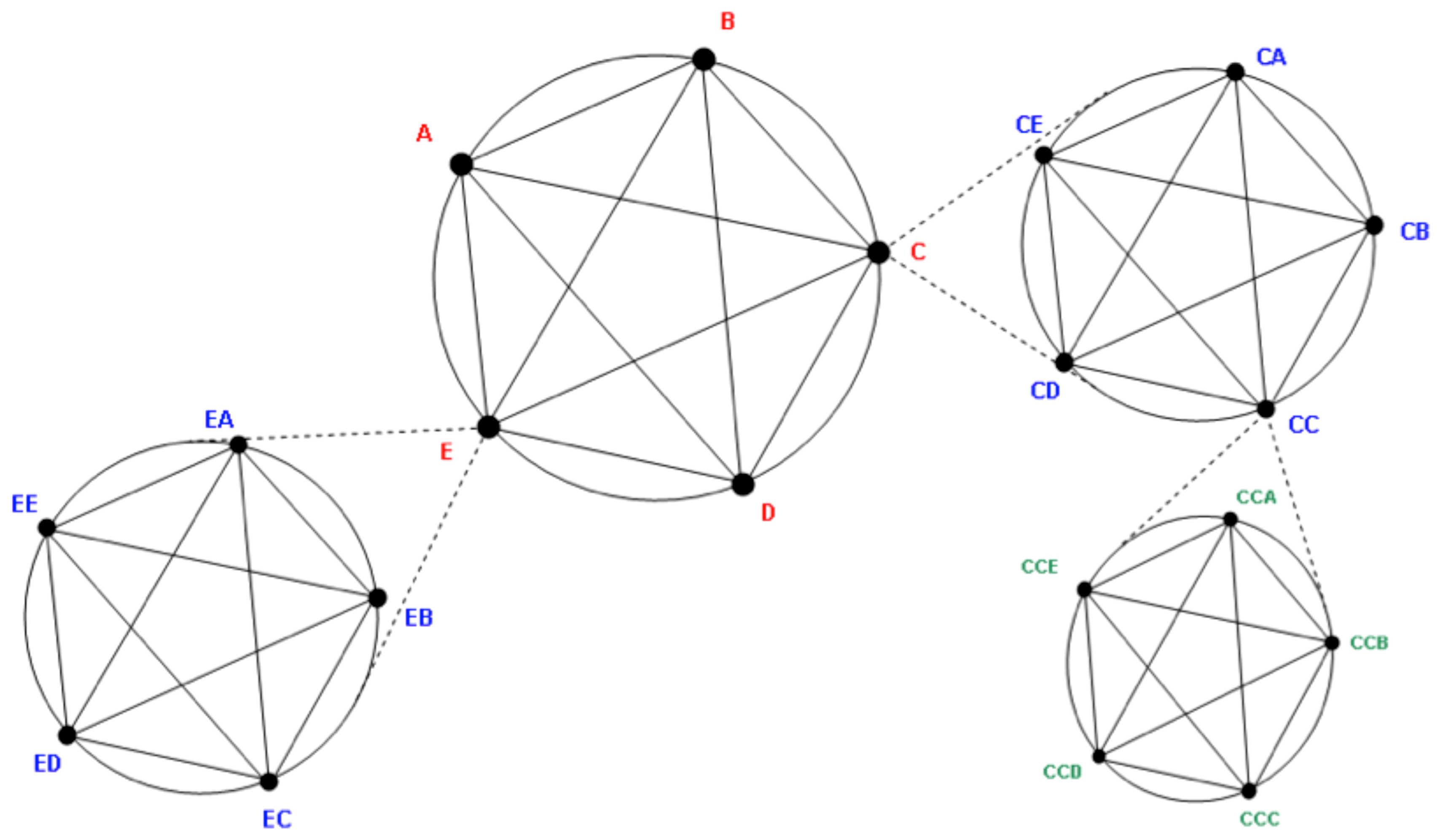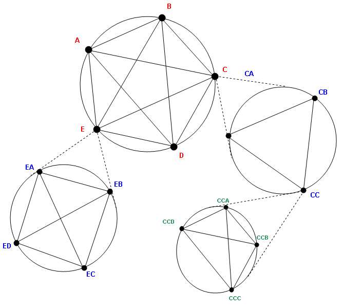 Here {A.B.C.D.E.} represents a broad initial view of a metadesign group of five agents, each with a complementary role. Each agent is assumed to have ‘needs’ (that facilitate their role function) and ‘assets’ (that service other needs within the team). The illustration shows how the fifth member agents (C and E) may link with other groups {CA.CB.CC.CD.CE.} and {EA.EB.EC.ED.EE.}. This permits a more detailed profile to implemented {CCA.CCB.CCC.CCD.CCE.}. N.B. |A.B.C.D.E.| can be viewed later as a composite agent within a larger system. As these views are part of a scalar continuum this analysis is fractal, even though groups and subgroups may be fluid, or may appear to consist of dissimilar entities. By choosing appropriate schema it would be possible to create a nested model (see Figure 4, below).