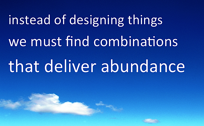 For example, placing two ‘problems’ in combination may, not only, reduce their unwanted qualities. But it also adds a synergy. For example, by combining two dangerous elements (Chlorine and Sodium) in the right way we may obtain edible table salt (NaCl). Nothing has been lost in this process (both elements are still present), but we also have a useful outcome that was not present before. This principle makes the notion of ‘difference’ a vital resource in its own right. Synergies are abundant. However, as we often fail to notice them, or to anticipate new ones designers need a combinatorial, relations-managing approach, rather than an outcome-seeking approach. synergy is one of the best-kept secrets of nature and it is unfortunate that we underestimate its importance within wealth creation. It is akin to a free bonus that we can get by combining things we already have. Some simple examples are relatively easy to grasp, as, for instance, the fact that stainless steel is up to 35% stronger than any of its ingredient materials. However, a relational approach is not as manageable as the more traditional (i.e. ‘form-giving’) modes of design, because it is usually unpredictable.