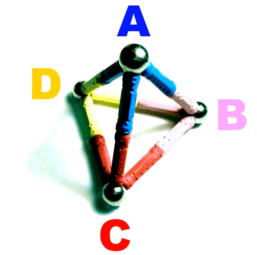 This implies that we would benefit from moving from a granular, object-defined logic of money to one that seeks to map relations in clusters that are small enough for humans to grasp, cognitively (e.g. say, four or five). The following example uses a tetrahedron as a standard figure for visualising six simultaneous relations. In practical terms, we are continuing to use this model as a template for revealing multiple synergies in which the 'intrinsic profits' are (meta)designed to serve up to six beneficiaries.