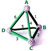Why do we want teams with 4 members? What's so special about a quartet, rather than, say, a trio or a quintet? OK, where 2 participants combine to make 1 interaction, a team of 3 will create 3 interactions. So, (numerically speaking) if each interaction leads to an idea, it doesn't matter whether we have two, or three, participants - we will get the same number of relations (=ideas) per person. However, a team of 4 offers twice as many relations as a team of 3. It will therefore deliver 50% more, per person, because having 4 team members implies 6 relations. In the diagrams below, imagine each node as a participant and each line as a relation that might lead to an idea - which might represent a synergy.