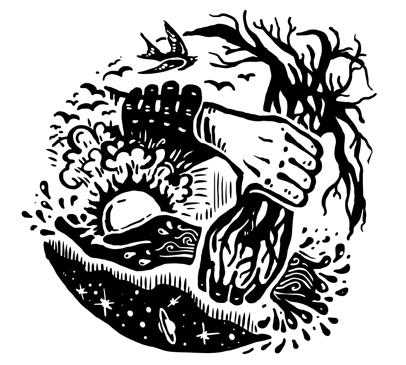 I must say, producing the illustrations for this book was intriguing and challenging. As a designer I was taught to begin with at least a basic grasp of the subject matter in order to respond strategically. I had planned to approach it strictly - to spend time researching, listening and designing a visual language that would complement the texts, if not elucidate them. So I spent the first few months talking on Zoom with the authors; discussing their ideas, enjoying their enthusiasm, seeking to get to grips with difficult things. I soon learned that the scale of the subject matter was ambitious and therefore speculative. Even though the concepts may be rooted in scientific facts and evidence, terms such as the ‘impending global catastrophes’ speak of a world of the ‘not-yet’. In this sense, the authors were raising questions and provocations that called for real imagination. This forced me to begin visualising before I had found a toe-hold on where I should be. Perhaps this is what some of the authors mean by ‘unthinkable’. It suggests that my task is to incite the reader to begin thinking whilst leaving room for unexpected things to show up. Fortunately, I didn’t need to force, or overwork the drawings, as they began to unfold themselves spontaneously. They were seeds that sprouted into a thicket, then a grove. I see my illustrations as more than a set of artefacts. For me, the book is a living ecosystem in which the illustrations play their part as members. By giving them a dreamlike, somewhat abstract rendering I aim to give the reader the opportunities to pause and reflect upon the ‘unthinkable’ paths that designers must take if the earth is to survive.
