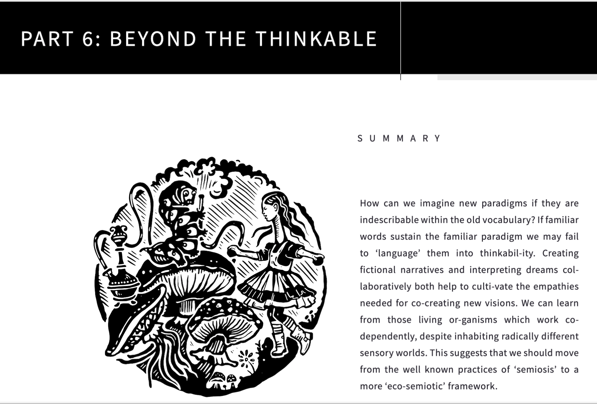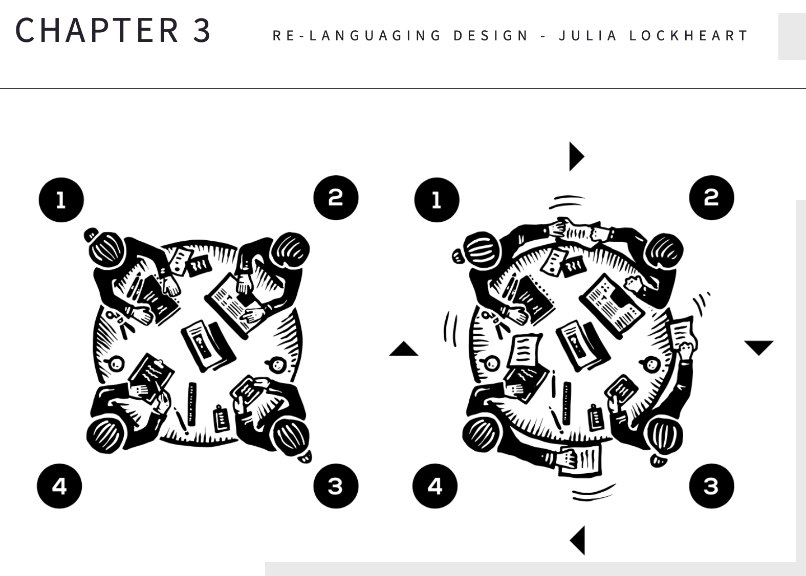 Actually, the first image you highlighted (in figure 4) was inspired by Olu Taiwo’s chapter on the African philosophy of Ubuntu - “I am, because we are, therefore I am”. Olu described ‘living knowledges’ as forms of practice and he provided a beautiful little reference sketch which I adapted to fit the visual language of the publication. It shows the hands that hold the paintbrush or pen. It shows the arms that can make contact with other arms. It shows the entanglement of human and non-human agencies, both living and non-living. I guess my provocation was that - just as we shape and ‘design’ our environments - so they shape us. Regaining this understanding can help designers to feel more attuned to ways that might seem ‘meta’ and remote, yet are accessible and intuitive if we work on how they are presented.