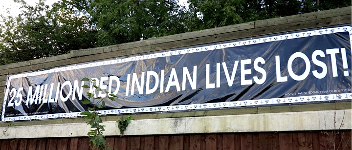 Edgar Heap of Birds, 'Red Indian Genocide, Population Control?', banner, 2012