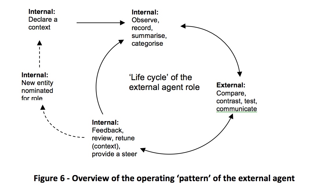 Once outside the group the External Agent develops an external perspective. This may be used to re-contextualise the team’s work. It may include observations of the team and, or, of external conditions, such as threats or opportunities.