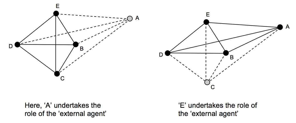 Fig 5 - Group of 5 operating as ‘4 plus 1’ (tetrahedral group with ‘temporary external agent’)